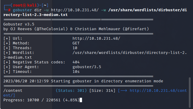 gobuster dir -u http://10.10.231.48/ -w /usr/share/wordlists/dirbuster/directory-list-2.3-medium.txt