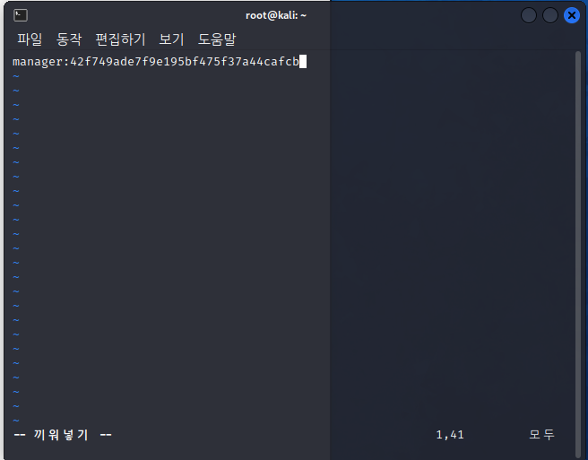 john --wordlist=/usr/share/wordlists/rockyou.txt --format=Raw-MD5 [방금 저장한 ID랑 PW 파일 위치]