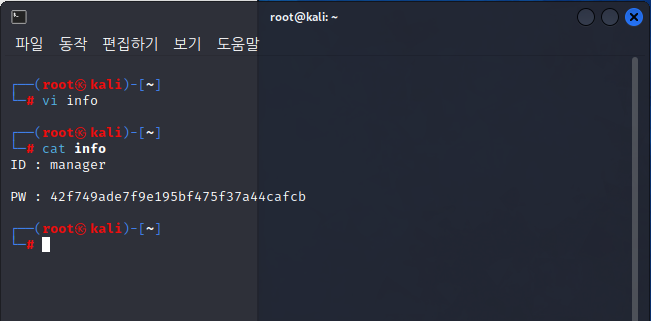 따로 파일에 저장을 하겠습니다. vi info 해서 작성 후 저장 그리고 언제든지 cat 문으로 확인 가능하게
